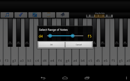 App play a note or a phrase of notes , and you sing for her.App play a note or a phrase of notes , and you sing for her.The piano keys that highlights note that you must sing and height , you are singing correctly .Monitor progress and gain stars for the great song.Designed in collaboration with Professor professional singing.Exercises to expand your vocal range .For beginners . Train your voice to sing in tune . Location for the training of singers.Series of levels and exercises to increase range and perfection . Interval training for singers.See how long you can hold land . The scores are stored in Progress.